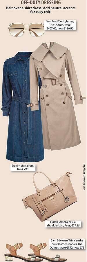 Belt over a shirt dress. Add neutral accents for easy chic.