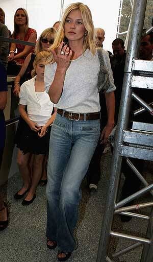 3. After singlehandedly kickstarting the trend for skinny jeans, Kate surprised her fans when she wore high-waist, flared jeans at the Topshop fashion show during London Fashion Week, in 2006. Pairing the 1970s-style jeans with a thin marl-grey t-shirt, Kate proved that she could make a jeans-and-tee combo look stylish.