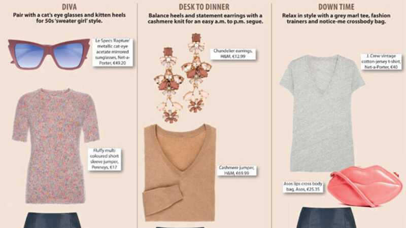 Pair with a cat’s eye glasses and kitten heels for 50s ‘sweater girl’ style.