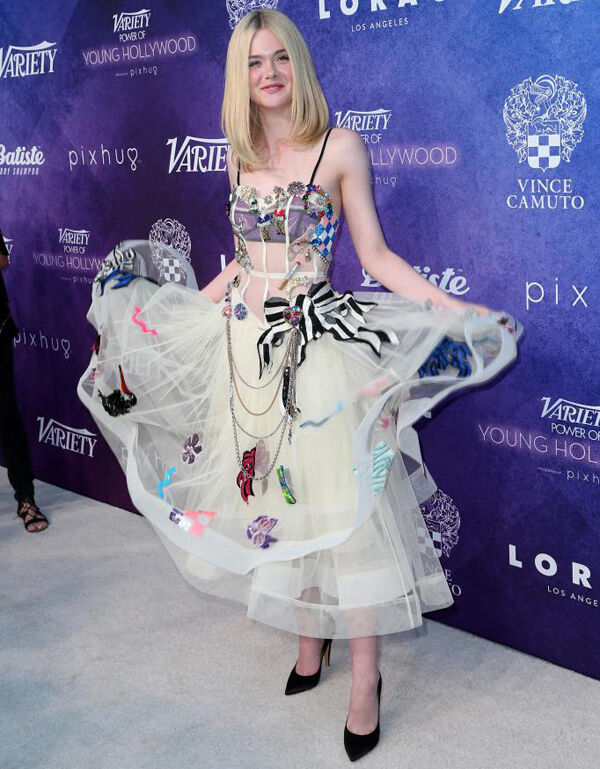 Elle Fanning made wearing her Marc Jacobs dress look like an awful lot of fun at the Variety ‘Power of Young Hollywood’ Party in Los Angeles. The tulle design features the iron-on patch style appliqués that cropped up in Jacobs’ kitschy, eighties-inspired Resort collection.