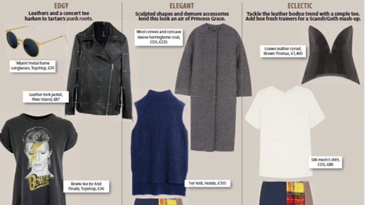 Leathers and a concert tee harken to tartan’s punk roots.