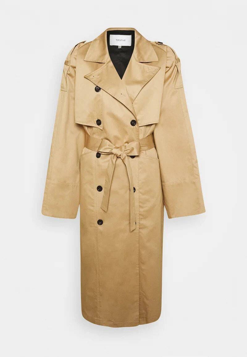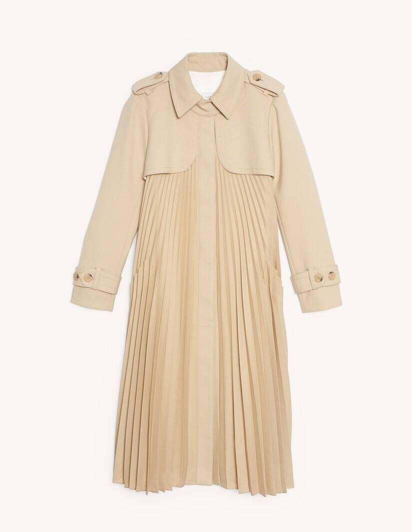 - Sandro offers a new twist on a classic with pleat-back trenches in camel and navy.