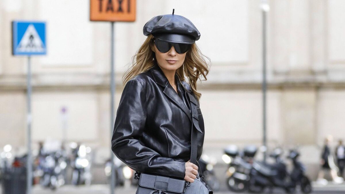 Influencer Gitta Banko, wearing a short leather blazer and grey pants with an asymetric zipper by Zara, a black 30 montaigne box bag by Dior, a black leather beret by Dior, black booties by Bottega Veneta and sunglasses by Bottega Veneta is seen during the Milan Women's Fashion Week on September 26, 2020 in Milan, Italy. (Photo by Streetstyleshooters/Getty Images)