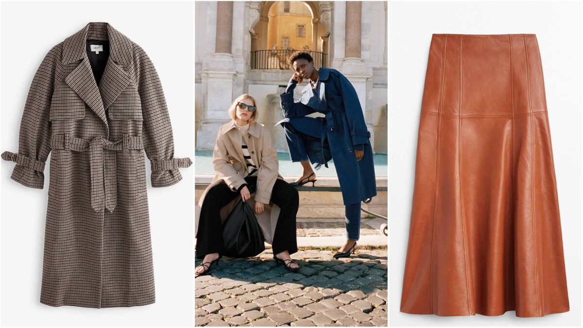 5. Left – Sunglasses, €29; camel trench coat, €179; striped sweater, €89; tapered trousers, €79; strappy sandals, €99; Right – Necklace, €49; blue trench coat, €179; ‘Favourite’ cut jeans, €79; kitten heels, €119, all from & Other Stories