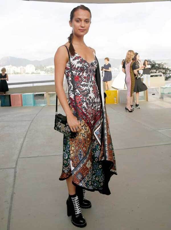The Danish Girl star donned a colourful LV handkerchief dress and high-heeled combat boots for the event.