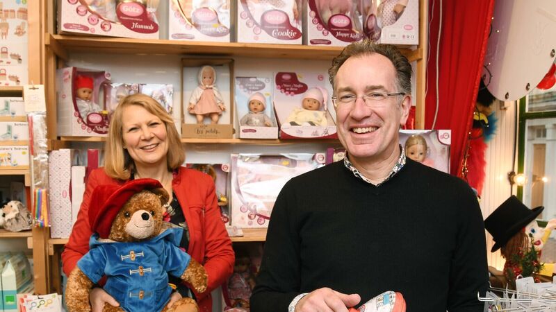 SPIN IT AGAIN: Wyon and Christel Stansfeld, owners, Pinocchio's Toys & Gifts, Paul St., Cork, with a traditional spinning top and Paddington Bear, two long-term favourites. Picture: Denis Minihane