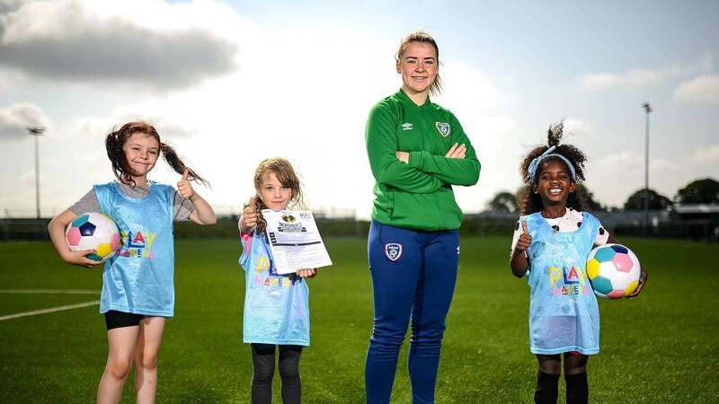Emily Whelan and some young players during the Disney Playmakers Launch in Abbotstown, Dublin last week. Picture: Stephen McCarthy/Sportsfile.