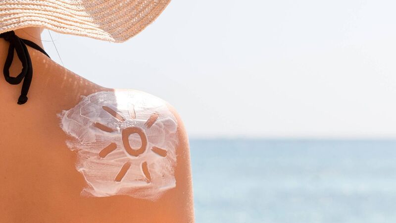 Sunscreen lotion in sun shape on tanned woman's shoulder.