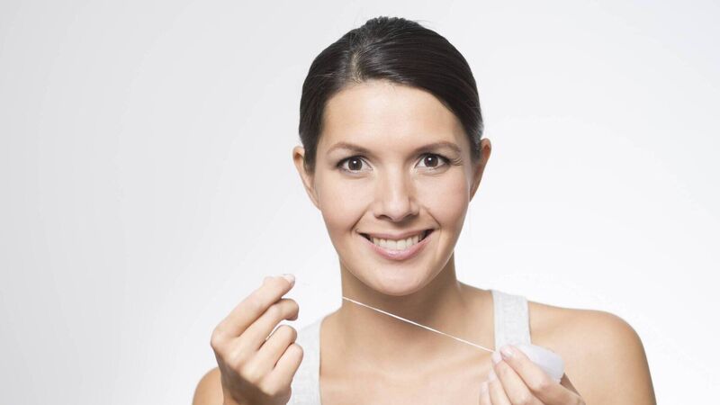 Woman flossing her teeth with dental floss to remove any food particles or bacteria caught between her teeth to prevent tooth decay or caries