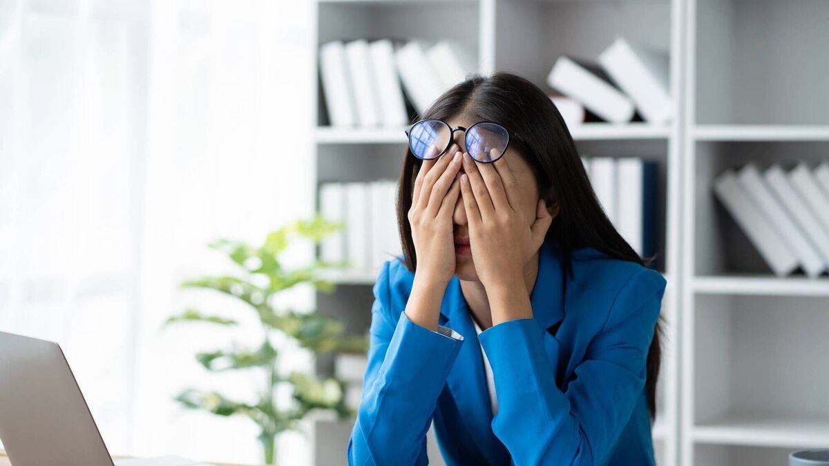 Asian tired business woman feeling overwhelmed and desperate after a long day at work.