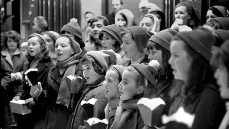 Young carol singers outside the Victoria Hotel, St. Patrick's Street, Cork in December 1965 Ref. 12/100