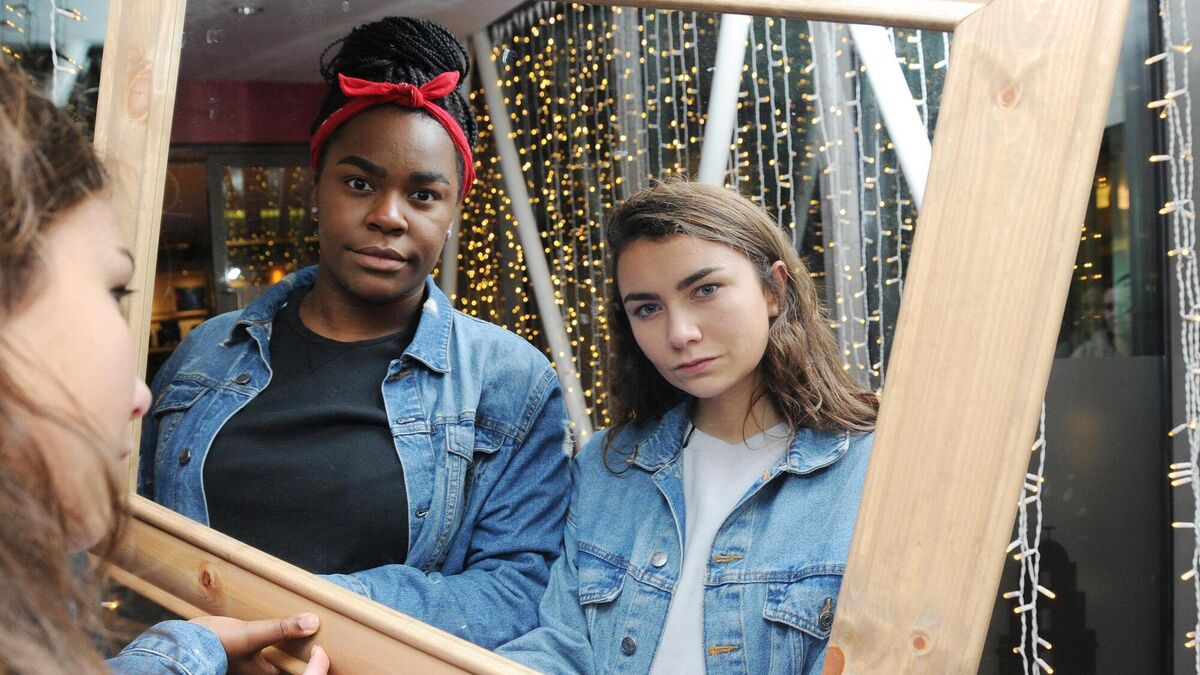 Young Offenders tv series. Actors Jennifer Barry (right) and Demi Isaac Oviawe.