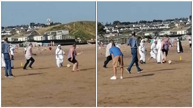 Watch: Nuns enjoy a game of 5-a-side soccer with locals on Cork beach
