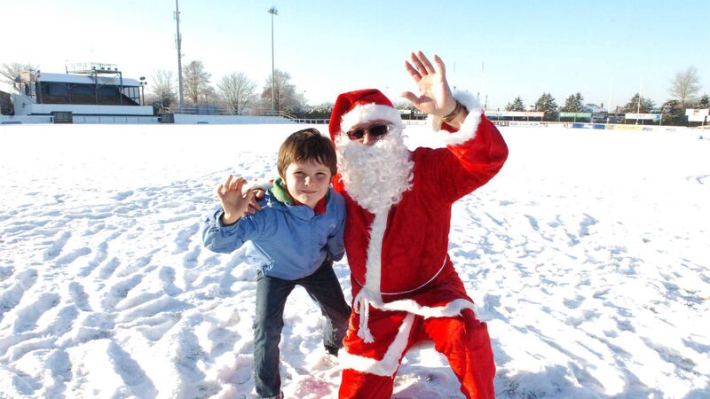 Santa and Jason Kiernan on the snow-covered pitch at Cork Constitution Rugby Club in December 2010. Picture: Larry Cummins