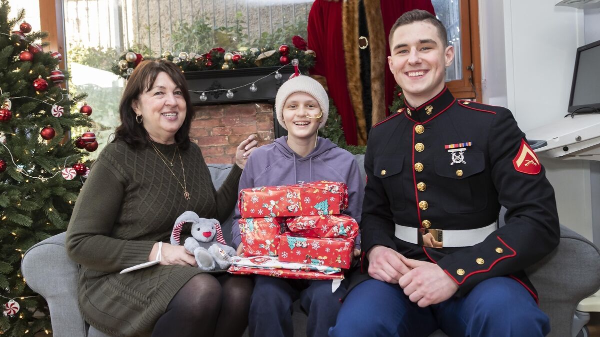 US Ambassador to Ireland, Claire D Cronin, with Naomi Howlin (14) from Wexford town, and US Marine Ethan Henderson. The US Ambassador and US Embassy Dublin’s US Marine Corps detachment delivered new toys to the children at Ronald McDonald House, at Children’s Health Ireland, Crumlin. Picture: Colin Keegan, Collins DublinÂ