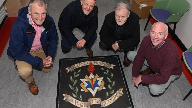 Former Douglas community school pupils who are organising a 50th class reunion: from left, John Turner, Frank Coughlan, Ger Power and Mick Barry with a crest of the original school Colaiste Muire, in the community school. Picture; Eddie O'Hare