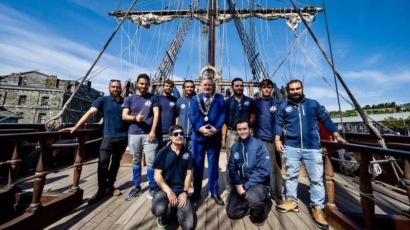 Lord Mayor of Cork, Cllr Dan Boyle, pictured with crew members of El Galeón, including Captain Miguel Cuesta and Communications Officer Lupo Bathke, during a welcome ceremony on board the Spanish training vessel. Docked at Custom House Quay as part of the Cork Harbour Festival, El Galeón is open to visitors all weekend. Picture Chani Anderson.