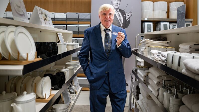 Francis Brennan amid his Francis Brennan The Collection display at Dunnes Stores, Patrick Street, Cork, marking ten years of his exclusive homeware partnership. Picture Chani Anderson.