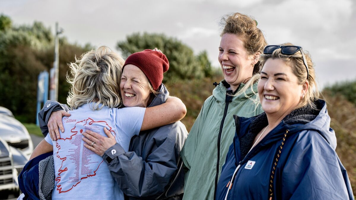 Smiles and hugs on the shore as friends reunite to celebrate the Sea Fillies’ achievement at Inchydoney Beach. Picture Chani Anderson.