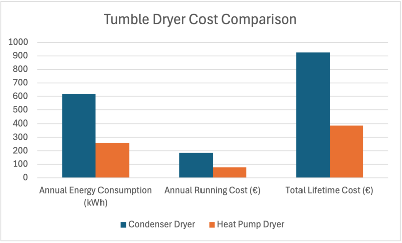 Allowing for a rough electricity cost of 30c per kWh (excluding VAT), the condenser dryer has running costs of €185.10 per year, but the heat pump dryer costs €77.40.