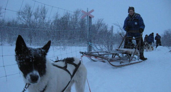 Above the baying din the dog trainer impressed upon us the importance of holding tight to the sled at all times and keeping the brake pressed down into the snow whenever we were going downhill or else the dogs would literally drag us to the North Pole.