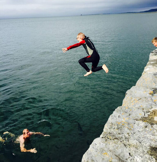 The kids and dad paddle over to the pier and join a gang of jumpers, all ages, high jinxing around, diving and ducking and hours pass as the they make new friends and their skin gets that salty sheen and their hair gets blonder and then it’s time to go back to Cork and real life.