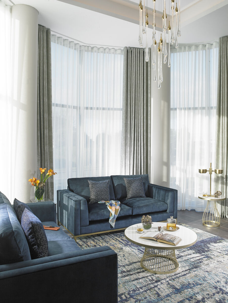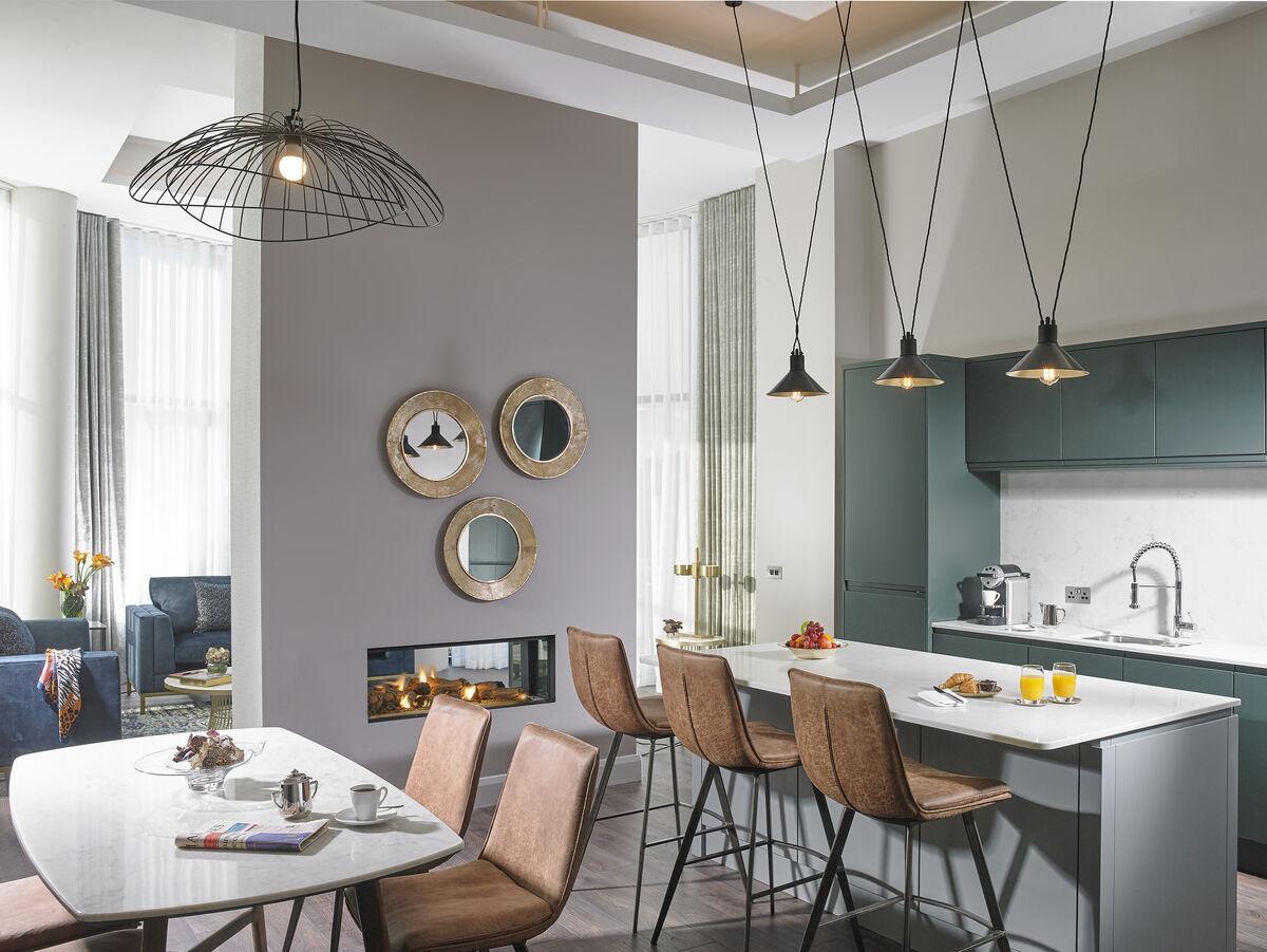 Opening the door to the second-floor suite, I’m treated to a guest bathroom doorway, a glimpse of a dream kitchen…ooh, and a stairway! This is a suite sight to behold. That full-sized kitchen, a gorgeous space with Scandi-style minimalism, is first in line. It features clean-lined sage units, a breakfast bar with low-lying pendant lighting plus a separate dining area with contemporary marble-top dining table and leather back chairs. Despite the designer kitchen look, the only drawback is the subtle absence of a stove, so this is more room service than channelling your inner Rachel Allen. Keeping up the hygge vibes is a dividing fireplace wall that flanks the adjoining lounge; a crescent-shaped den with velvet sofas, swish rugs and wrap-round windows that stretch across double floors (plenty of acoustic flow for that Chromecast TV and its pretty impressive speakers).
