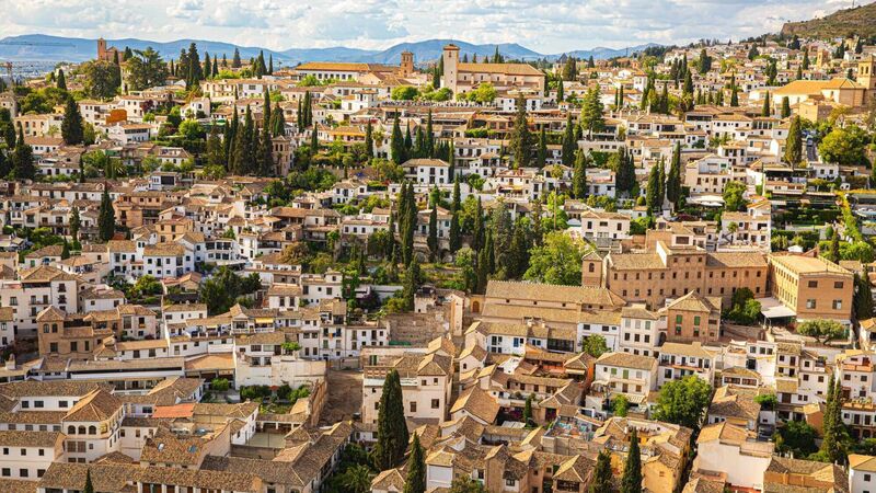 The historic Albaicín neighbourhood with its terracotta rooftops, whitewashed houses, and cypress trees.