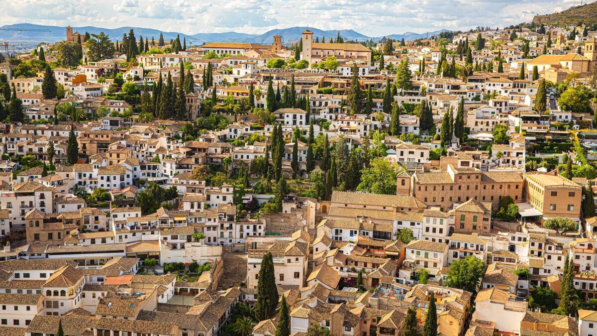 The historic Albaicín neighbourhood with its terracotta rooftops, whitewashed houses, and cypress trees.