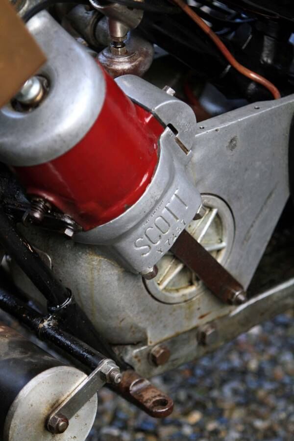 In the Scott is a water cooled 596cc twin cylinder two-stroke engine designed and built a long time before this type of engine reached the GP circuits. However by then exposed flywheels, hand gearchanges, advance/retard levers, air slides, oil drippers, one jet carbs etc. were well in the past.