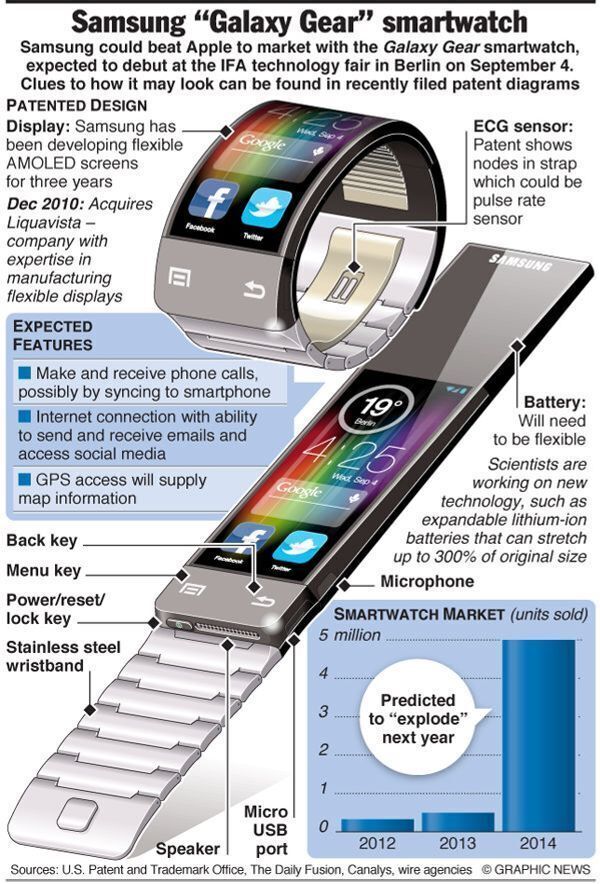 It was not clear if Samsung would use the Galaxy Gear trademark for a smartwatch. The trademark application covers 38 possible products including mobile phones, bracelets, glasses, and software interfaces that monitor human vital signs.