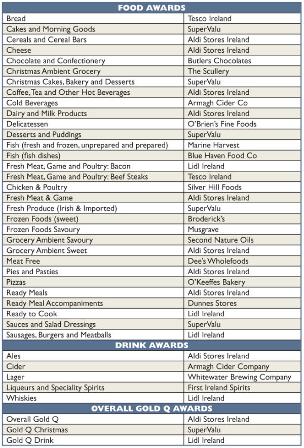 Lidl won a Gold Q for its Dundalgan Irish Whiskey, produced by Terra Ltd. in Cavan. It also won awards for its ready-to-cook meals, streaky bacon, sausages, burgers, and meatballs.