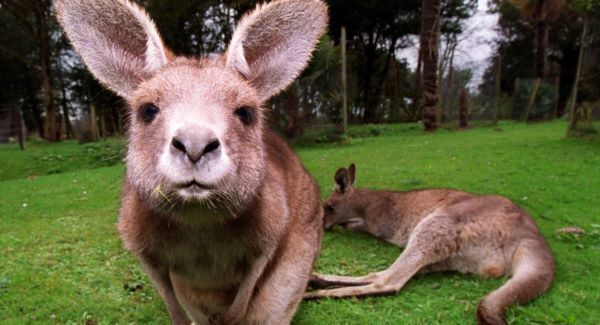 Footage has emerged of two kangaroos settling their differences like real kangaroos do - with a boxing match in the street.