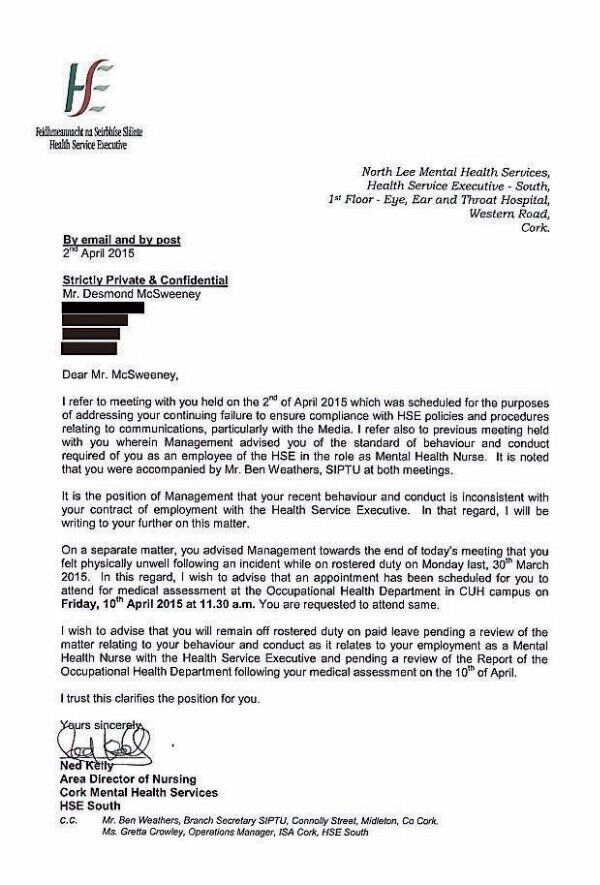 Mr McSweeney received a letter from the HSE on March 31 advising him that he was “off duty with pay” for continuing to talk to the media after being advised that he was in breach of HSE “policies and procedures in relation to communications, particularly with the media”.