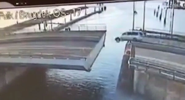 A Dutch man had a miraculous escape after a crazy attempt to jump his car across a retracting bridge.
