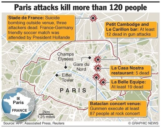 Seven attackers launched gun attacks at Paris cafes, detonated suicide bombs near France’s national stadium and killed hostages inside the concert venue during a show by an American rock band.