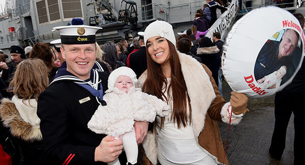 ALL I WANT FOE CHRISTMAS IS YOU... Return of LE Samuel Beckett to the Irish Naval base at Haulbowline. Molly Histon O'Sullivan greets dad LEA Charlie O'Sullivan after his return from duty in the Mediterranean Sea.
