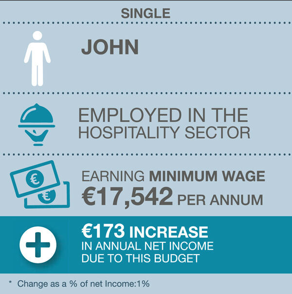 • A single person working in the hospitality sector on minimum wage () will see an increase of per year in income (€3.33 / week)