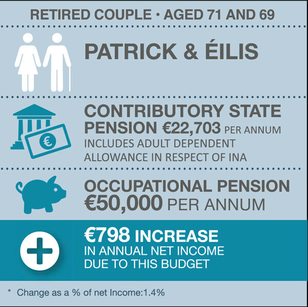 • A retired couple on a contributory state pension of €22,703 PLUS their own pension from employment of €50,000 per year will see €798 more per year (€15.35 / week).