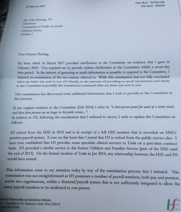 "H3, while retired from the HSE, is currently in public services on a part-time basis in Tusla," Mr O Brien wrote.