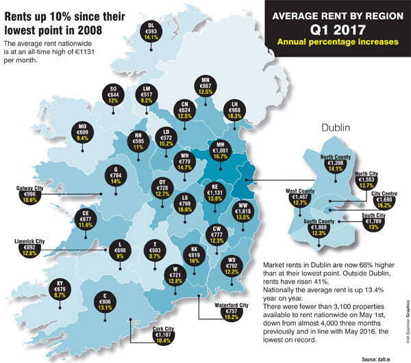 In Dublin, rents increased by 13.9% in the year to March. Prices are now 15.4% higher than the peak of early 2008 — an average of almost €225 a month extra.