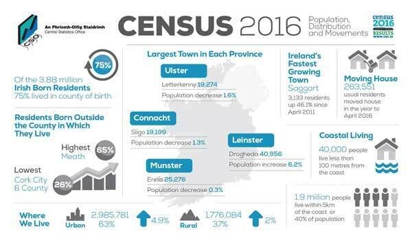 It also shows that Saggart in north County Dublin was the fastest growing town, while Drogheda in County Louth remains Ireland's largest town with a population of almost 41,000.