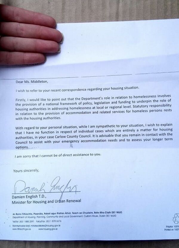 "While I am sympathetic to your situation, I wish to explain that I have no function in respect of individual cases which are entirely a matter for housing authorities, in your case Carlow County Council," he wrote.