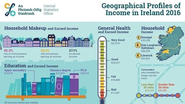 The median earned income for those with a PhD was €60,912, nearly five times higher than the €14,684 for a person with no education. Dublin City had the highest earned income per person working for payment or profit at €39,999 in 2016, followed by Dún Laoghaire-Rathdown (€37,117) and Cork City (€34,317).