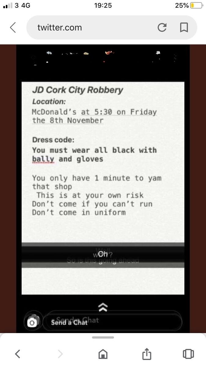 A message inciting the would-be riot was spread on social media last week, called 'JD Cork City Robbery.'
