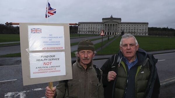 From this morning a number of protesters stating their opposition to an Irish Language Act being included in any potential deal set up camp outside the talks venue holding aloft union flags.