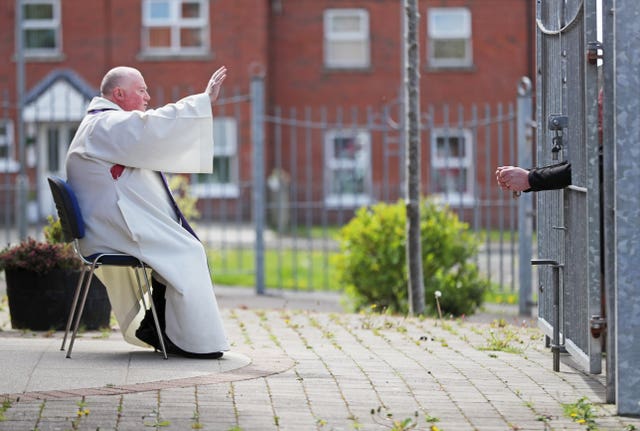 Fr Tim Bartlett from St Mary's Church in Belfast offers a blessing to Annette Daly on John Street during Pentecost Sunday. Parishioners asked for the church to visit the local community to deliver Holy Water during the lockdown. Picture: PA