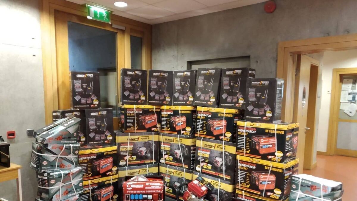 The 12 chainsaws, 11 generators and seven power washers and assorted tools a woman was pressured into buying. Picture: An Garda Siochána