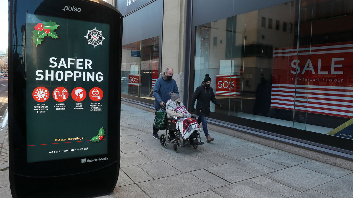 People walk past an ad for the PSNI’s seasons greetings operation on a quiet street in Belfast city centre as the six week lockdown in Northern Ireland continues. Picture: Brian Lawless/PA