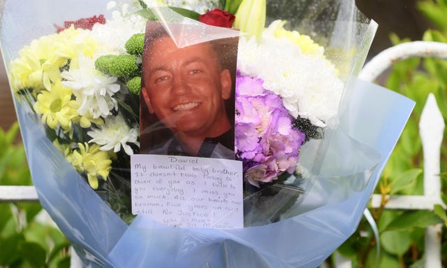 Several bunches of flowers and balloons imprinted with a photograph of Byrne and the words “We miss you so much David” were tied to the railings.